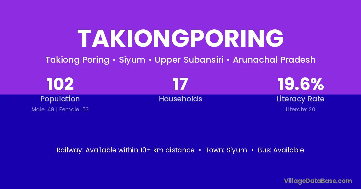 Takiongporing village has a total population of 102 people, of which 49 are males and 53 are females.