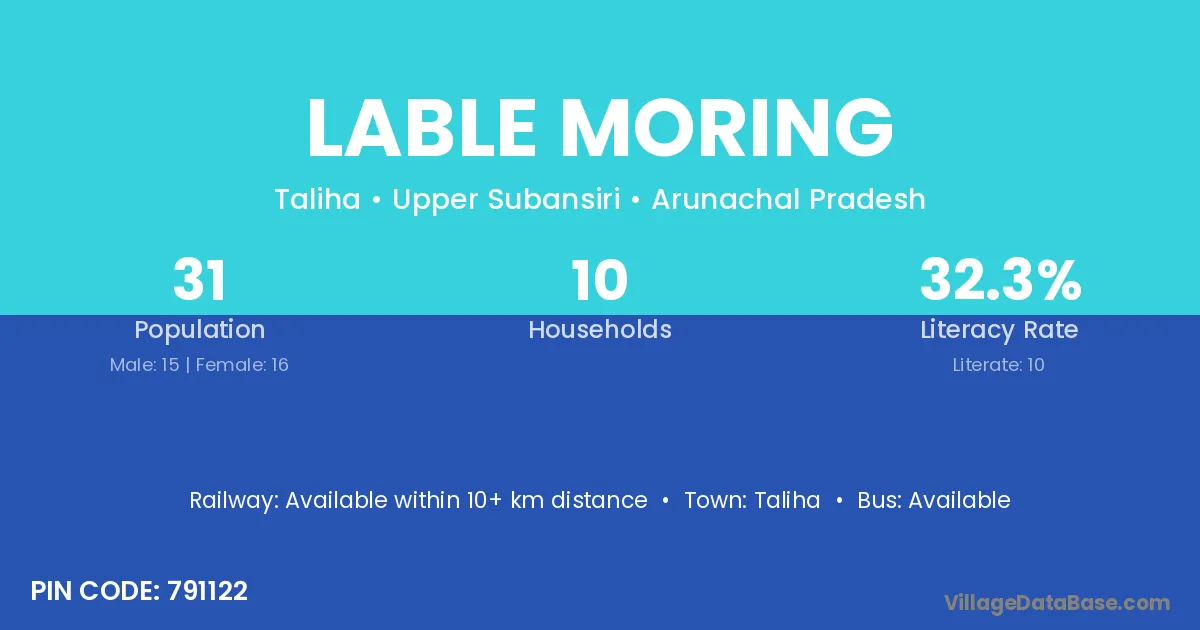 The literacy rate of Lable Moring village is 32.26%. Male literacy stands at 40.00% and female literacy at 25.00%.