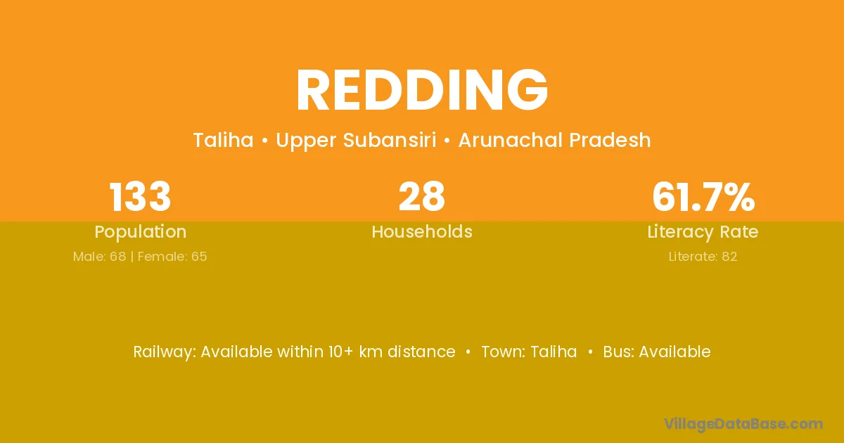 The literacy rate of Redding village is 61.65%. Male literacy stands at 60.29% and female literacy at 63.08%.