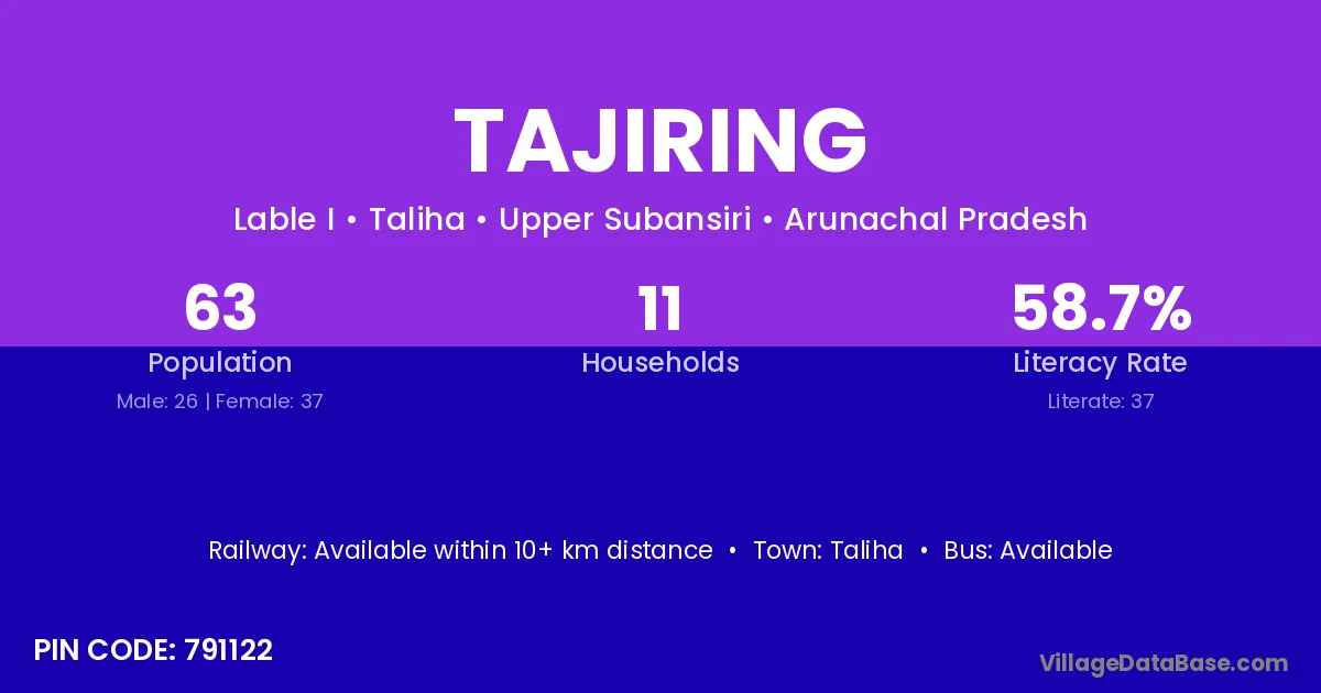 Tajiring village has a total population of 63 people, of which 26 are males and 37 are females.