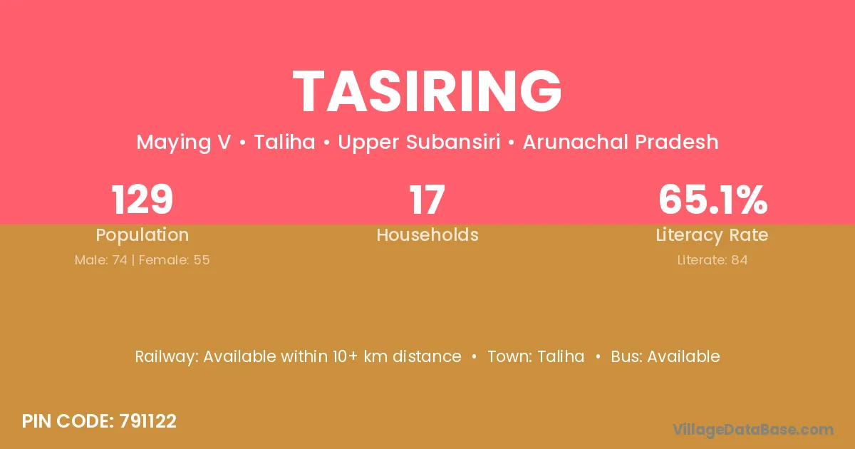 Tasiring village has a total population of 129 people, of which 74 are males and 55 are females.