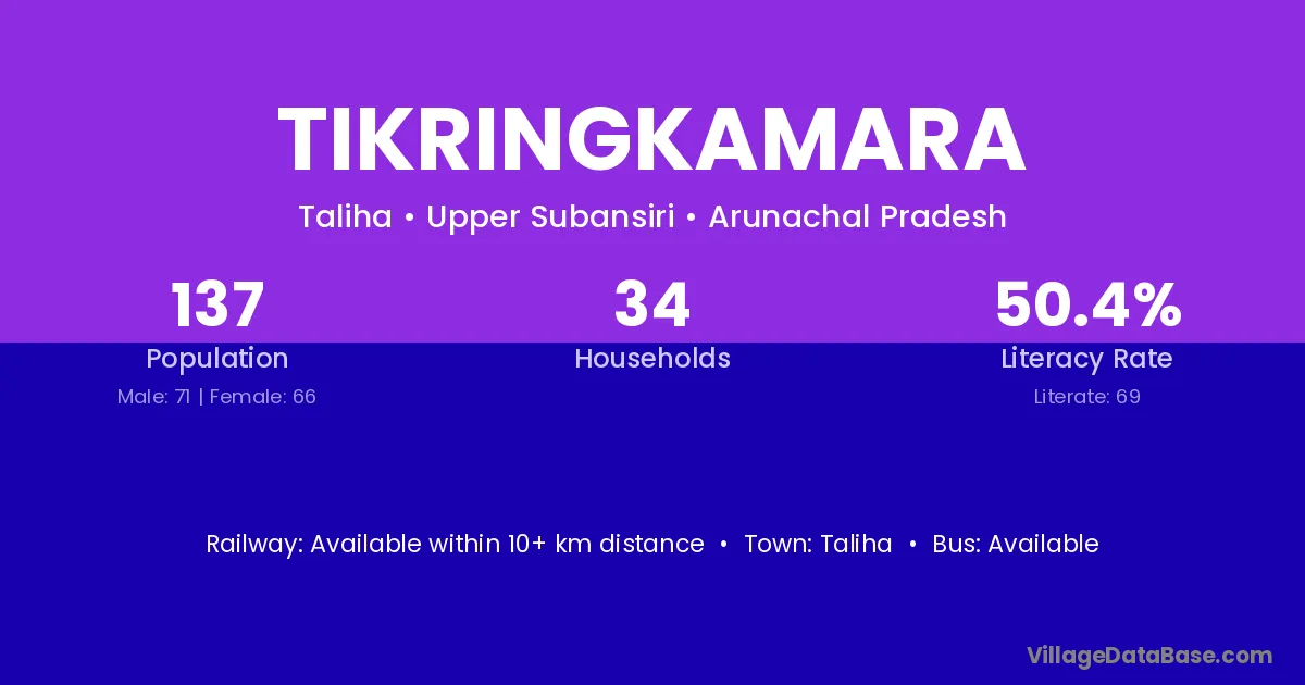 Tikringkamara village has a total population of 137 people, of which 71 are males and 66 are females.