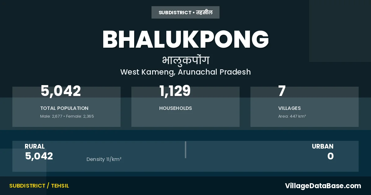According to the 2011 census The total area of Bhalukpong Circle is 447 km², with a population of 5042 people. The population density is 11 inhabitants per square kilometre, and there are approximately 1129 houses in the sub district.