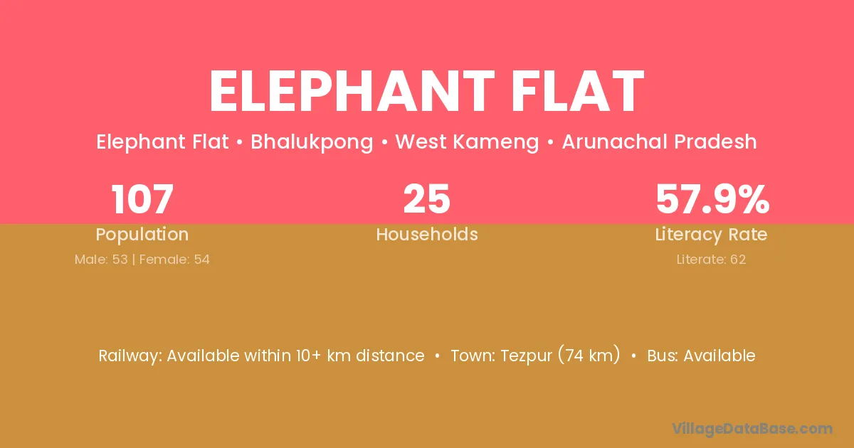 Elephant Flat village has a total population of 107 people, of which 53 are males and 54 are females.