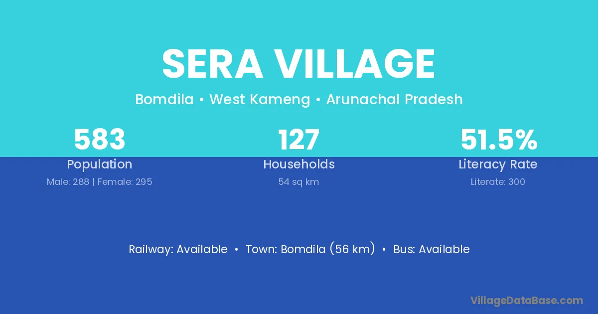 Bomdila (56 km) is the nearest town to Sera Village village for major economic activities and is located approximately 56 km away.