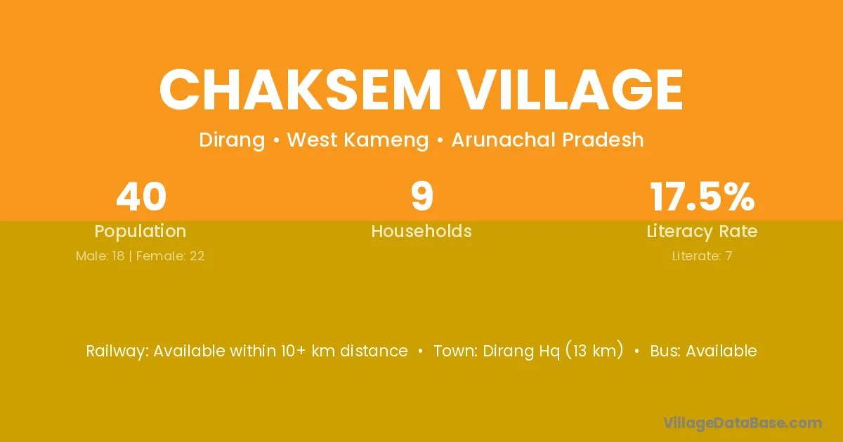 Dirang Hq (13 km) is the nearest town to Chaksem Village village for major economic activities and is located approximately 13 km away.