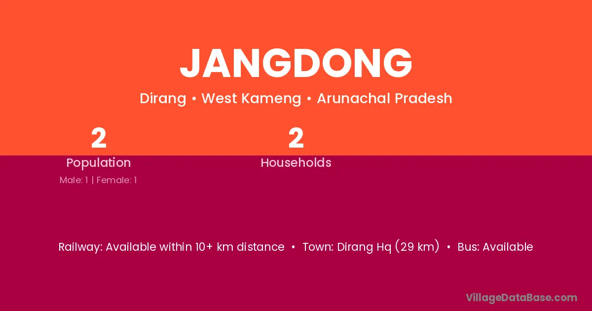 Dirang Hq (29 km) is the nearest town to Jangdong village for major economic activities and is located approximately 29 km away.