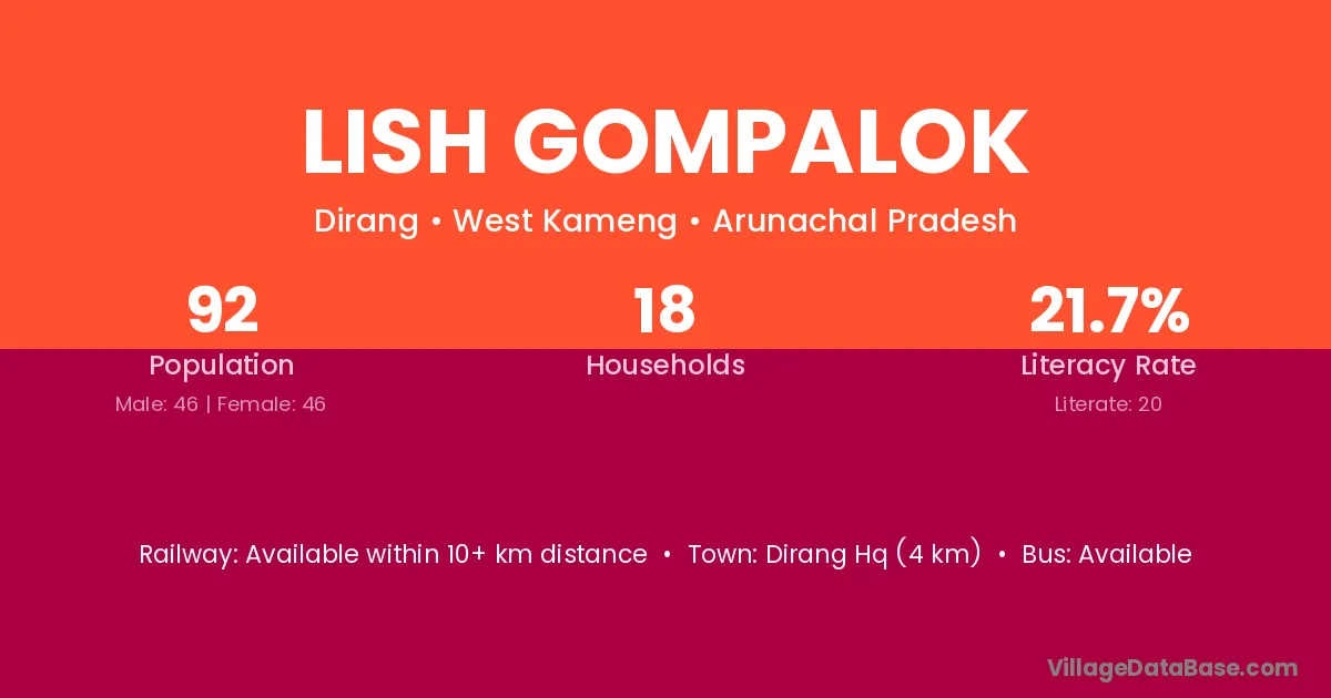 Lish Gompalok village has a total population of 92 people, of which 46 are males and 46 are females.