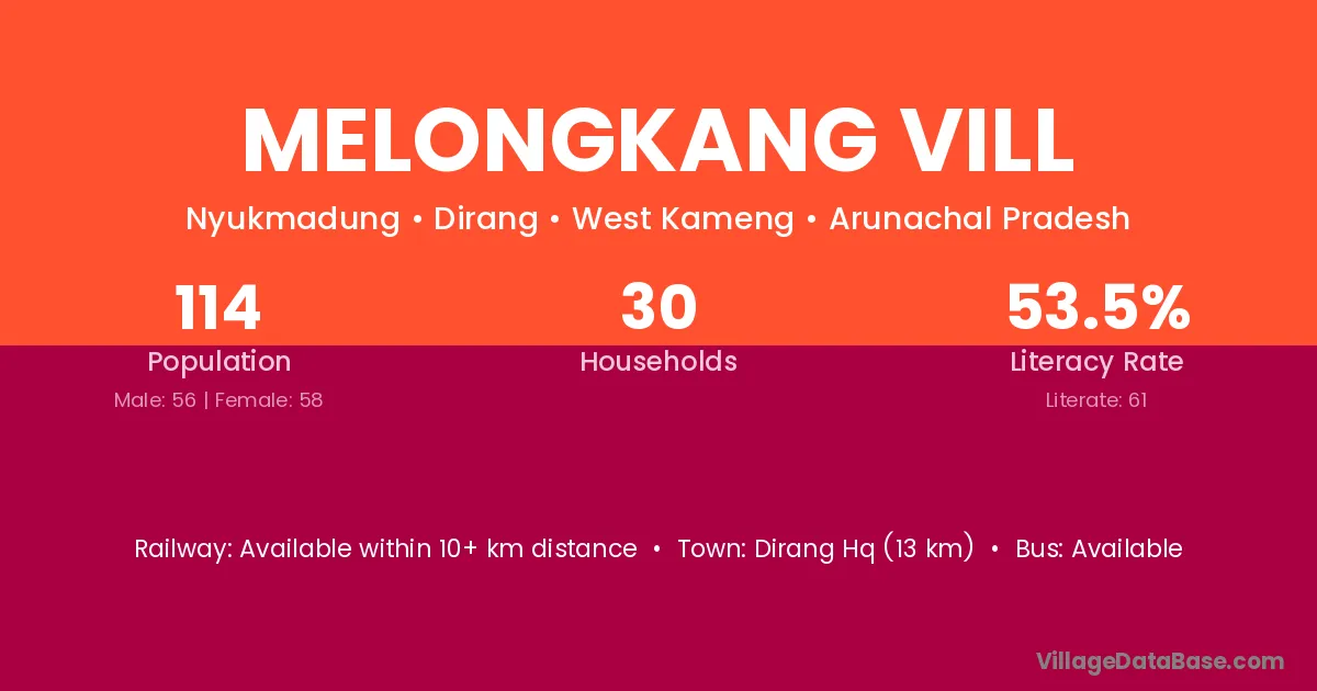 Dirang Hq (13 km) is the nearest town to Melongkang Vill village for major economic activities and is located approximately 13 km away.