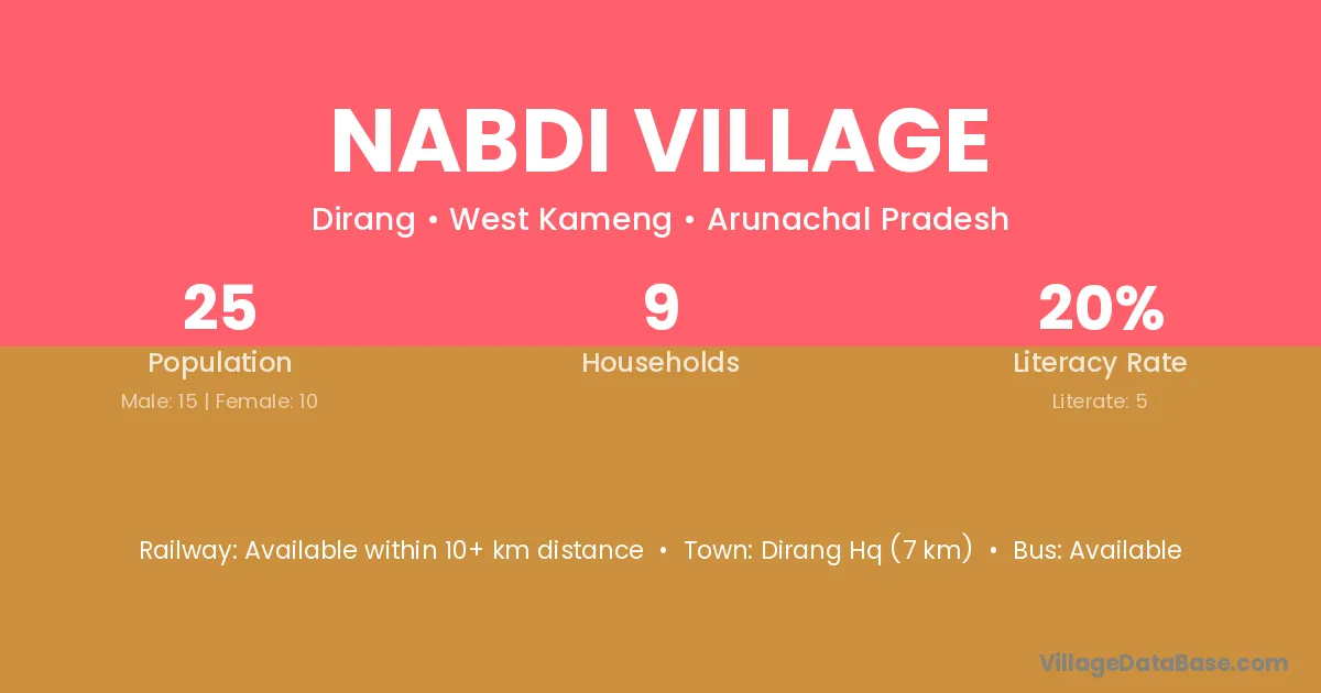 Dirang Hq (7 km) is the nearest town to Nabdi Village village for major economic activities and is located approximately 7 km away.