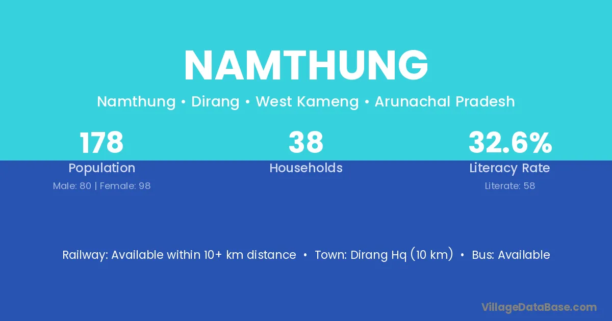 Dirang Hq (10 km) is the nearest town to Namthung village for major economic activities and is located approximately 10 km away.