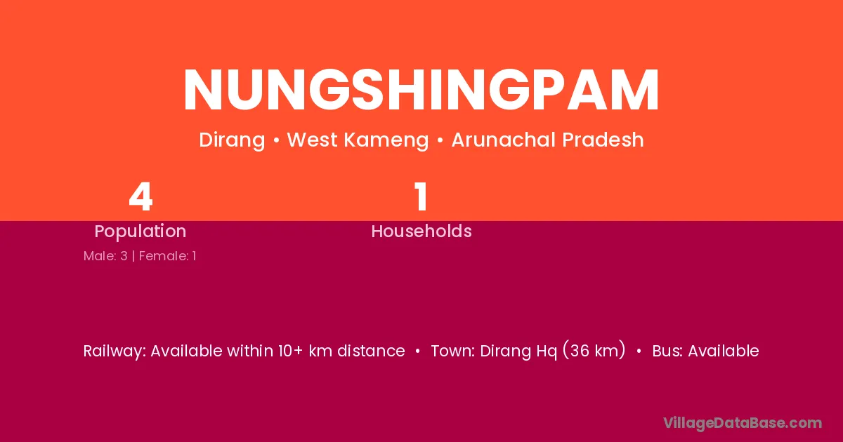 Dirang Hq (36 km) is the nearest town to Nungshingpam village for major economic activities and is located approximately 36 km away.