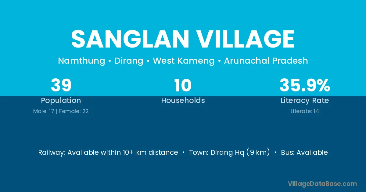 Dirang Hq (9 km) is the nearest town to Sanglan Village village for major economic activities and is located approximately 9 km away.