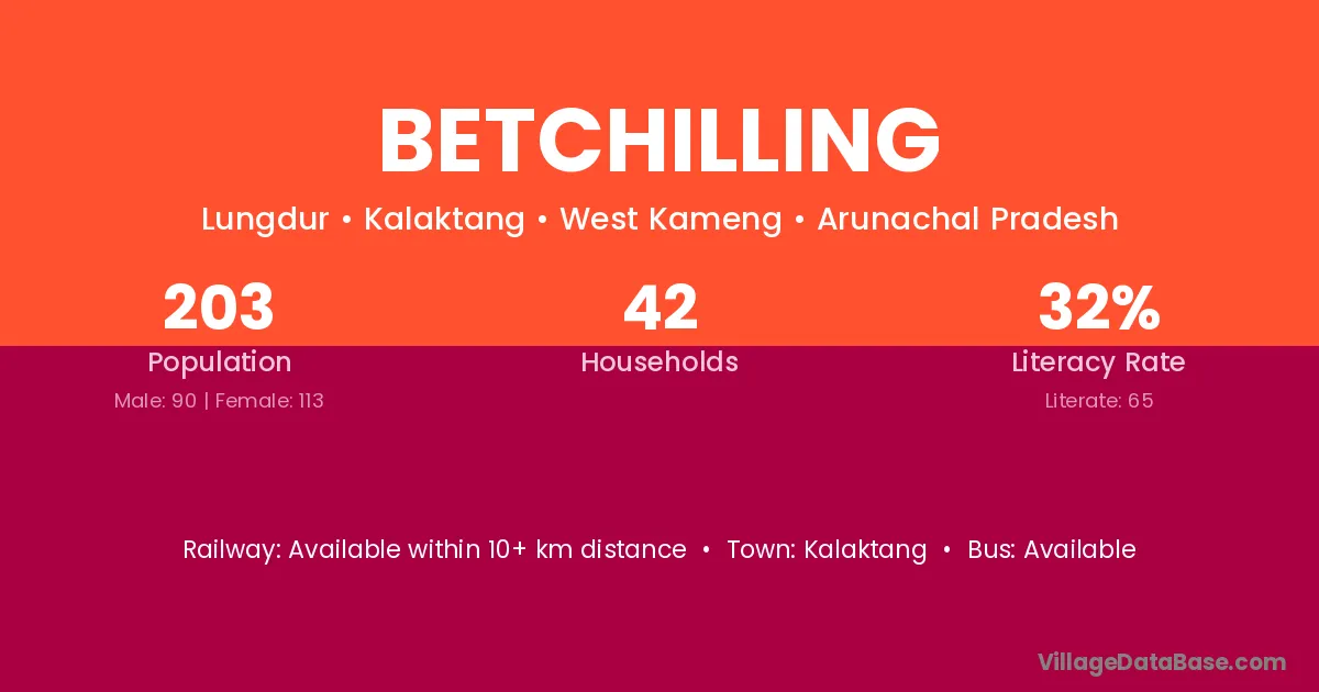 The literacy rate of Betchilling village is 32.02%. Male literacy stands at 38.89% and female literacy at 26.55%.