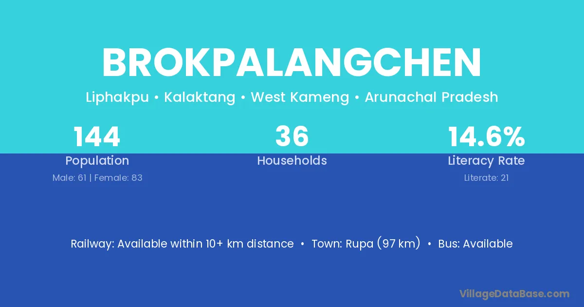 Brokpalangchen village has a total population of 144 people, of which 61 are males and 83 are females.