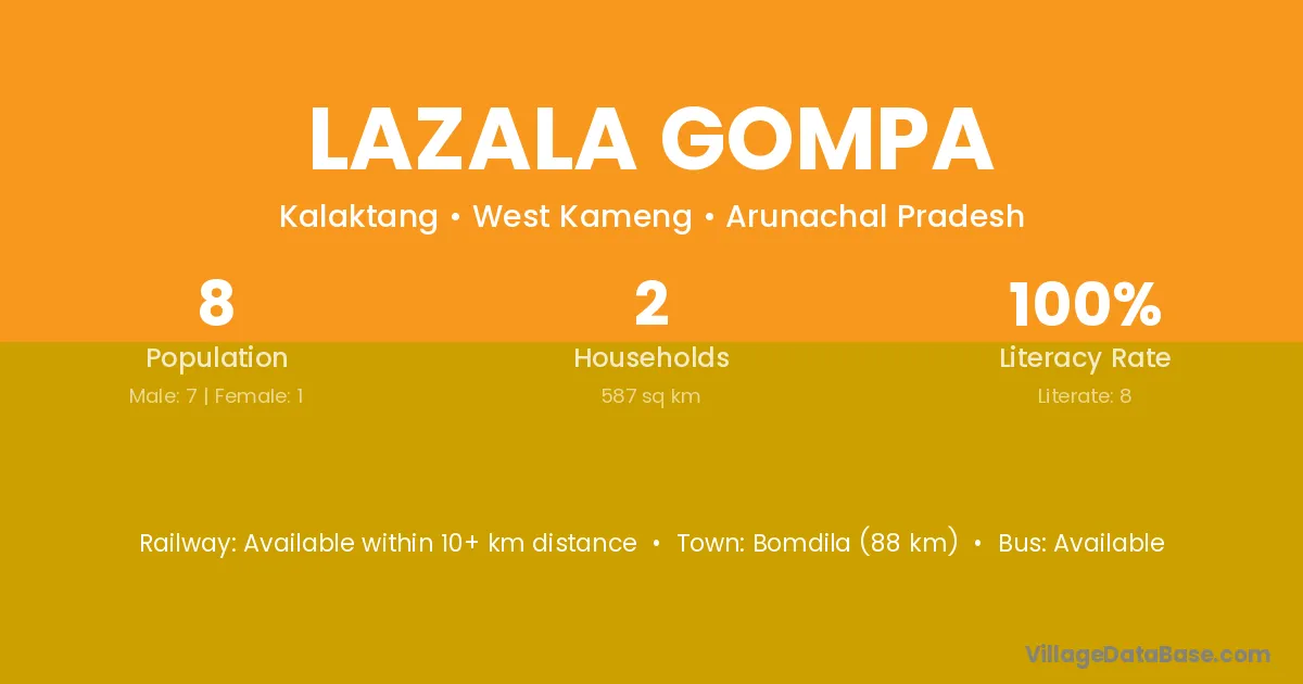 Lazala Gompa village has a total population of 8 people, of which 7 are males and 1 are females.