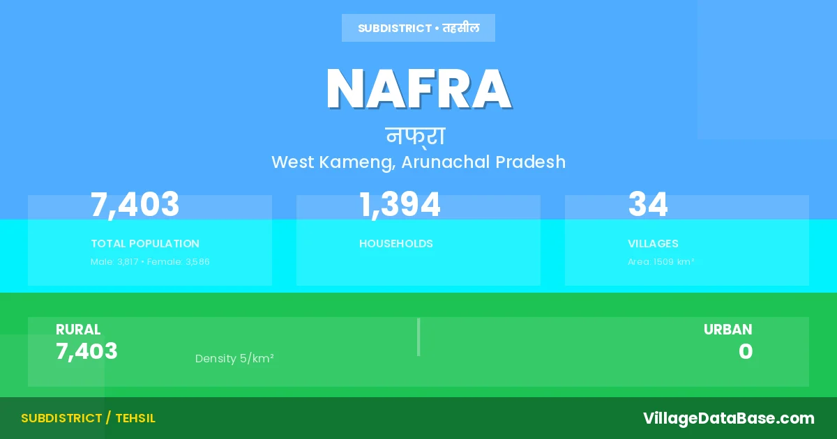 According to the 2011 census The total area of Nafra Circle is 1509 km², with a population of 7403 people. The population density is 5 inhabitants per square kilometre, and there are approximately 1394 houses in the sub district.