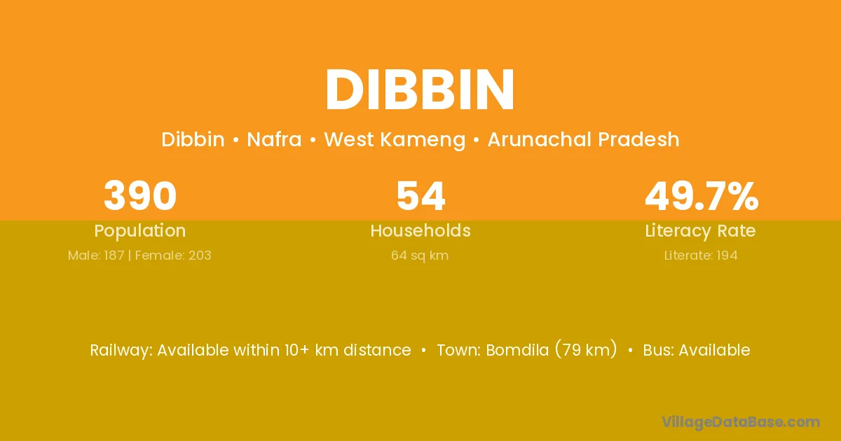 Bomdila (79 km) is the nearest town to Dibbin village for major economic activities and is located approximately 79 km away.