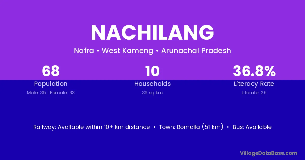 Bomdila (51 km) is the nearest town to Nachilang village for major economic activities and is located approximately 51 km away.