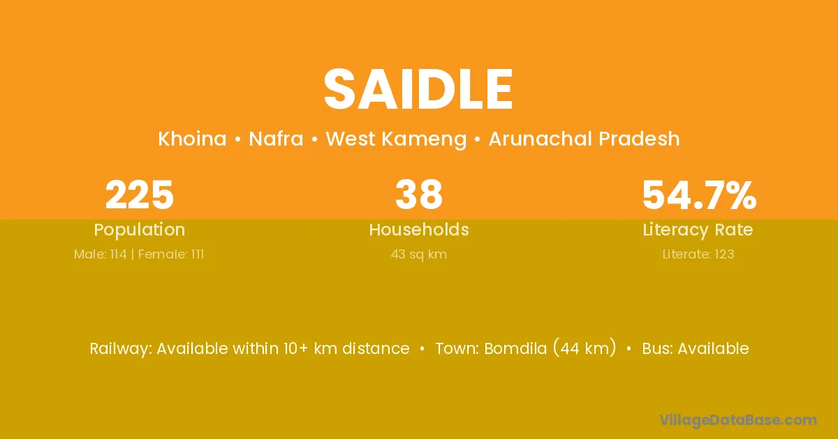Bomdila (44 km) is the nearest town to Saidle village for major economic activities and is located approximately 44 km away.