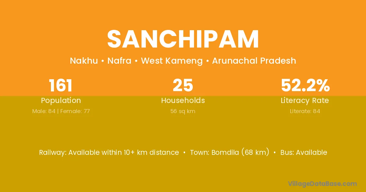 Bomdila (68 km) is the nearest town to Sanchipam village for major economic activities and is located approximately 68 km away.