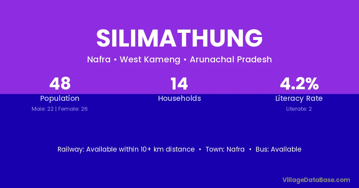 The literacy rate of Silimathung village is 4.17%. Male literacy stands at 9.09% and female literacy at 0.00%.