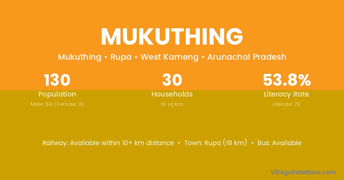 Rupa (18 km) is the nearest town to Mukuthing village for major economic activities and is located approximately 18 km away.