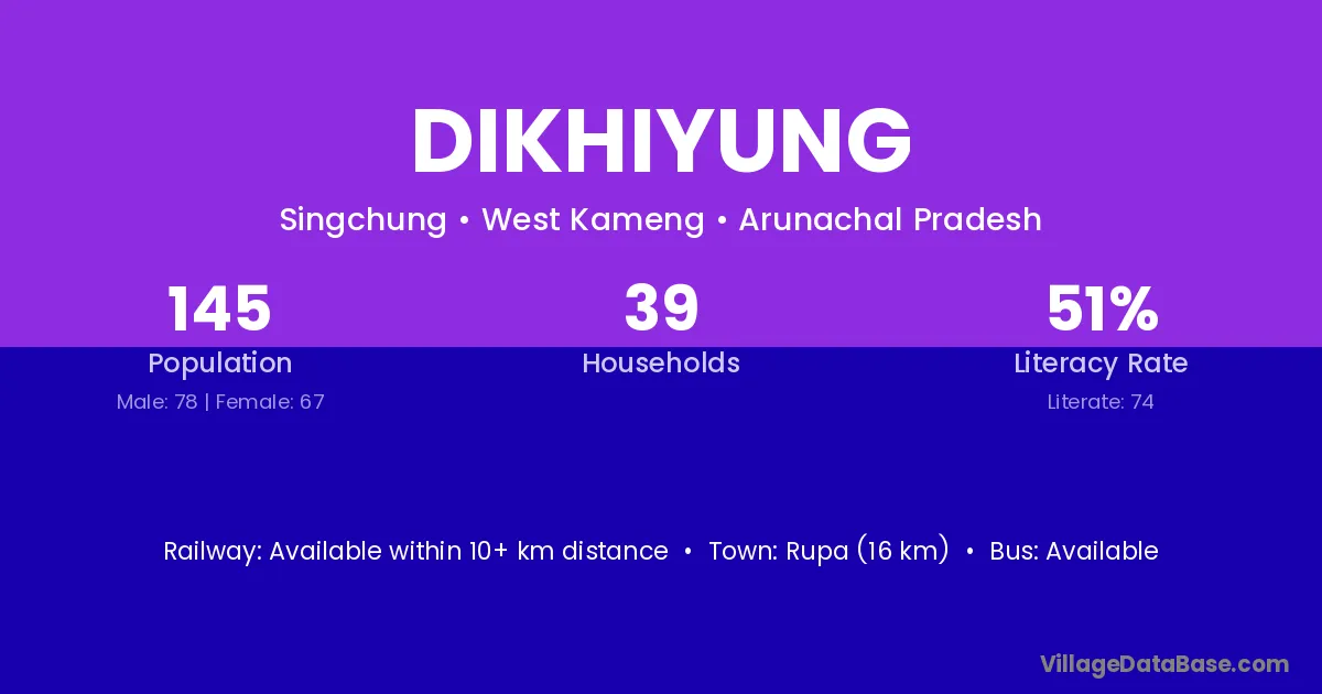 Dikhiyung village has a total population of 145 people, of which 78 are males and 67 are females.