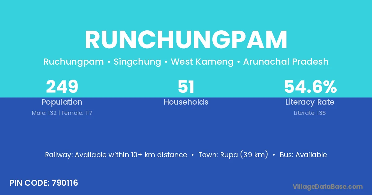 Rupa (39 km) is the nearest town to Runchungpam village for major economic activities and is located approximately 39 km away.