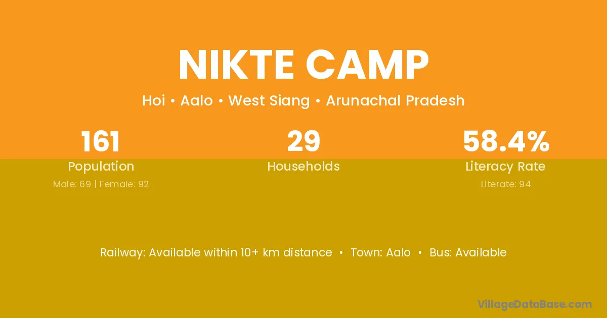 Nikte Camp village has a total population of 161 people, of which 69 are males and 92 are females.
