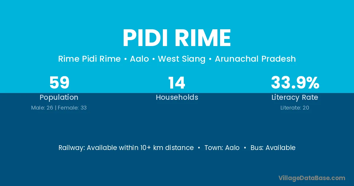Pidi Rime village has a total population of 59 people, of which 26 are males and 33 are females.