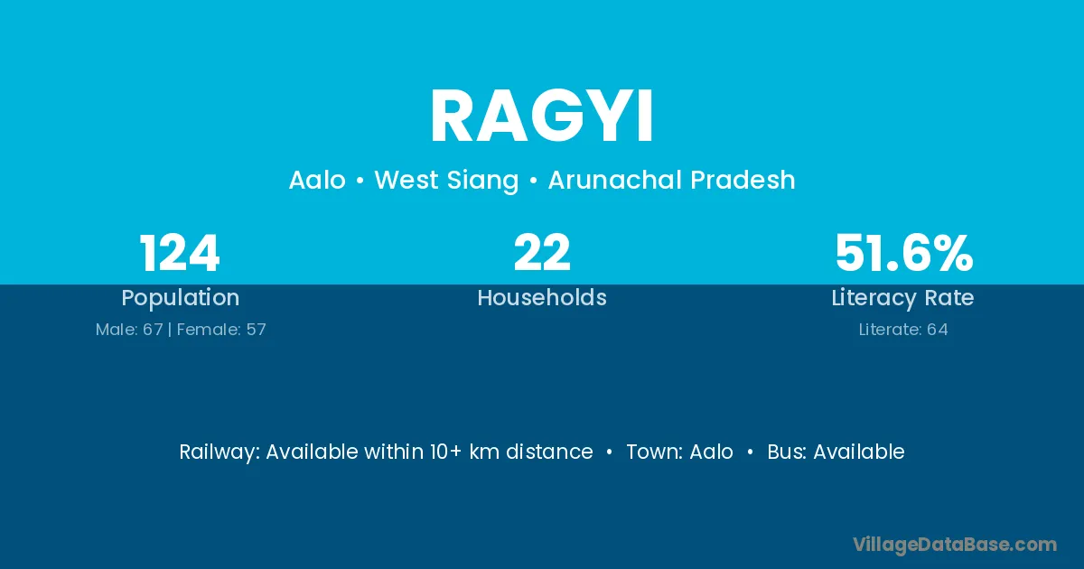 Ragyi village has a total population of 124 people, of which 67 are males and 57 are females.