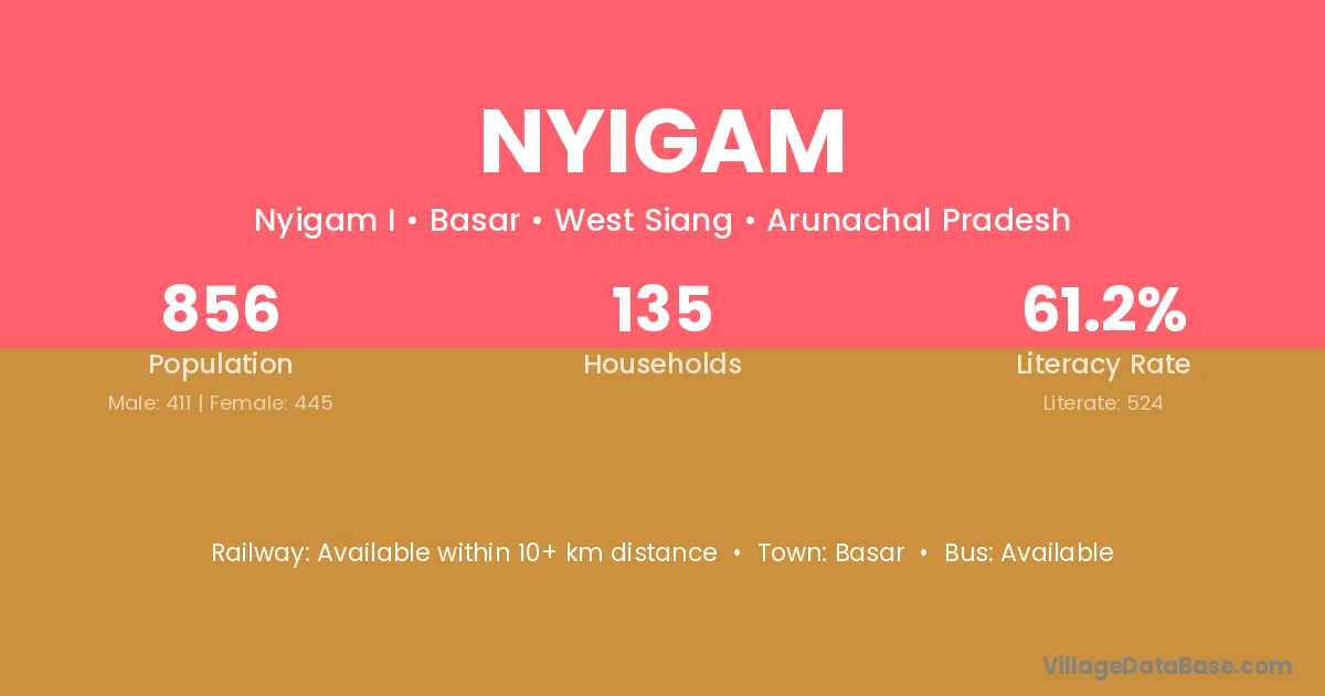 Nyigam village has a total population of 856 people, of which 411 are males and 445 are females.