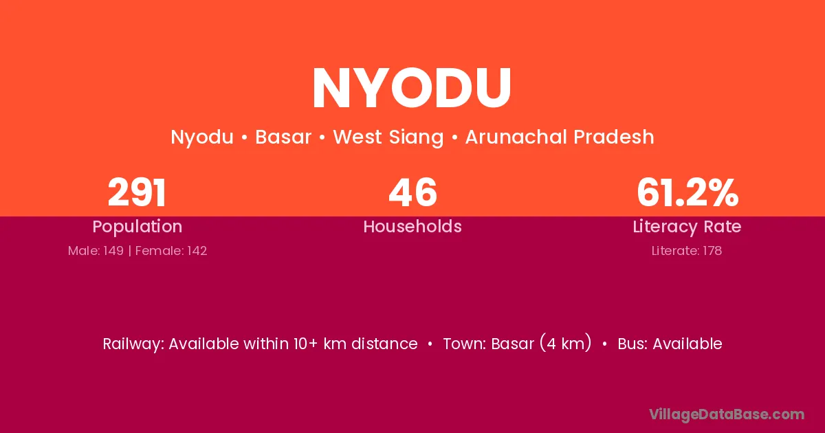 Basar (4 km) is the nearest town to Nyodu village for major economic activities and is located approximately 4 km away.