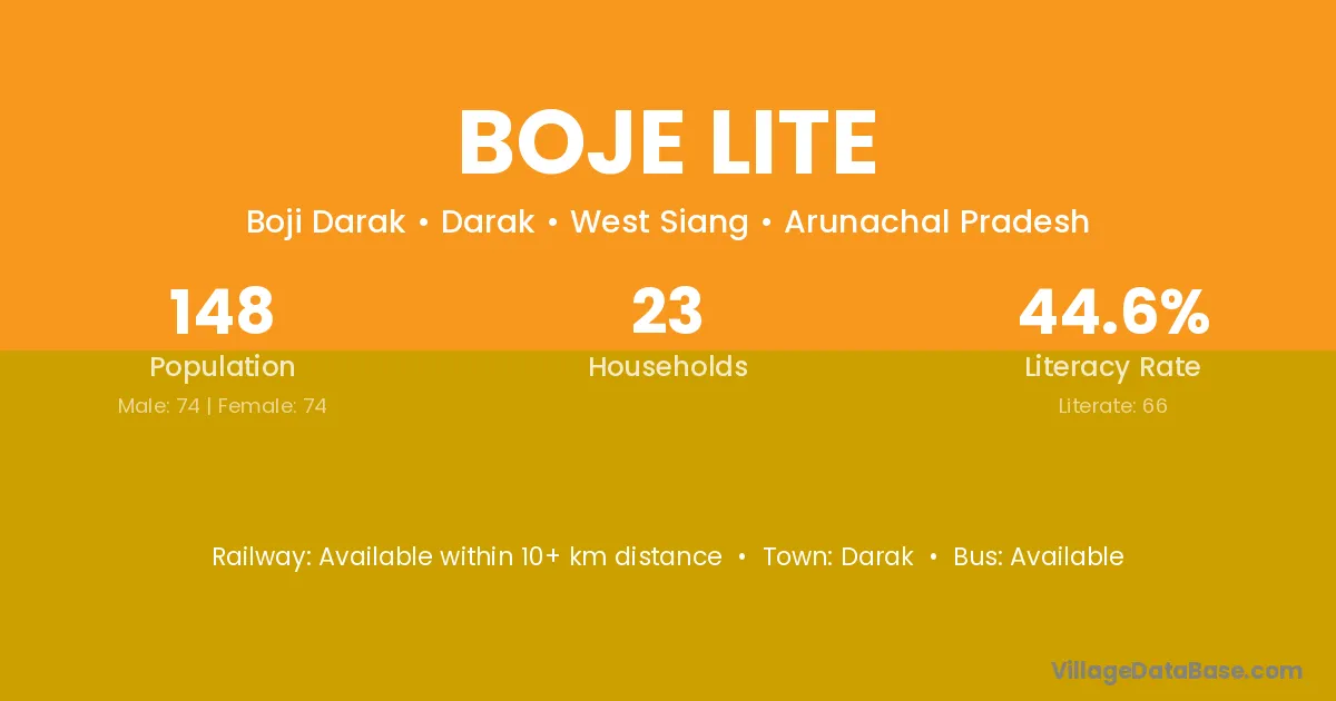 The literacy rate of Boje Lite village is 44.59%. Male literacy stands at 55.41% and female literacy at 33.78%.