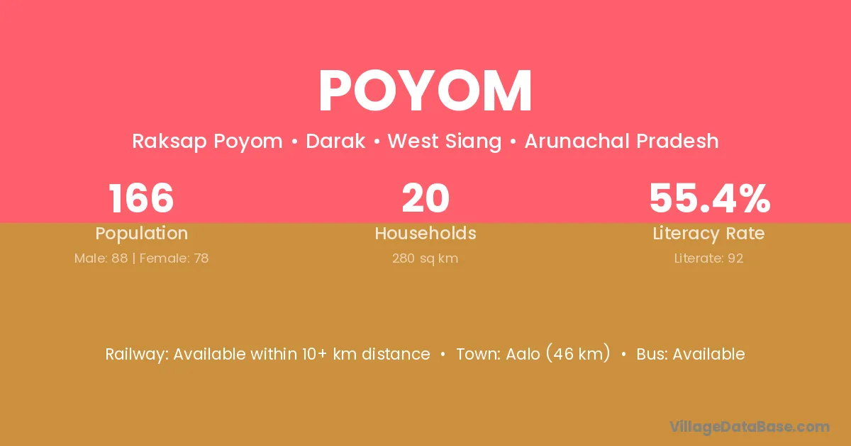 Aalo (46 km) is the nearest town to Poyom village for major economic activities and is located approximately 46 km away.