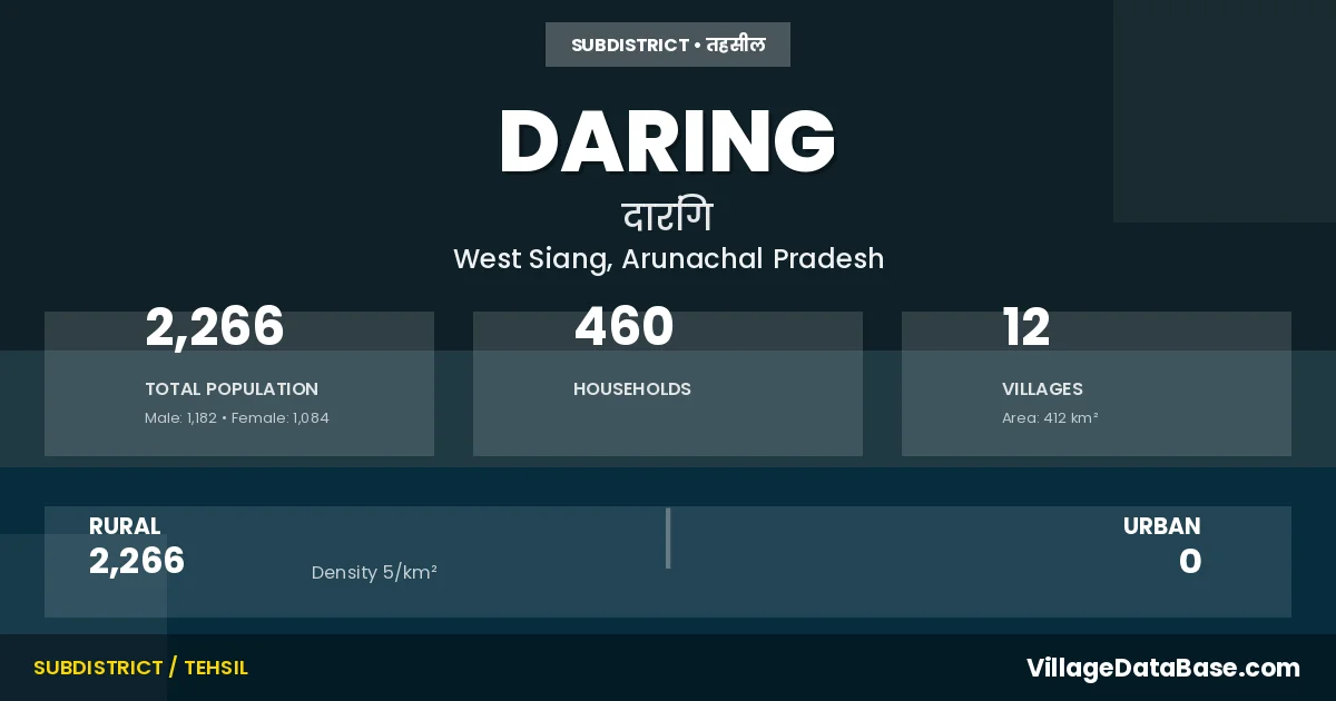Daring is a town and Circle in the West Siang district of the Arunachal Pradesh. In India, a Circle is a subdivision of a district responsible for the administration and revenue collection of a specific area within the district. Circles play a crucial role in the local governance structure, contributing significantly to the development and administration of their communities.