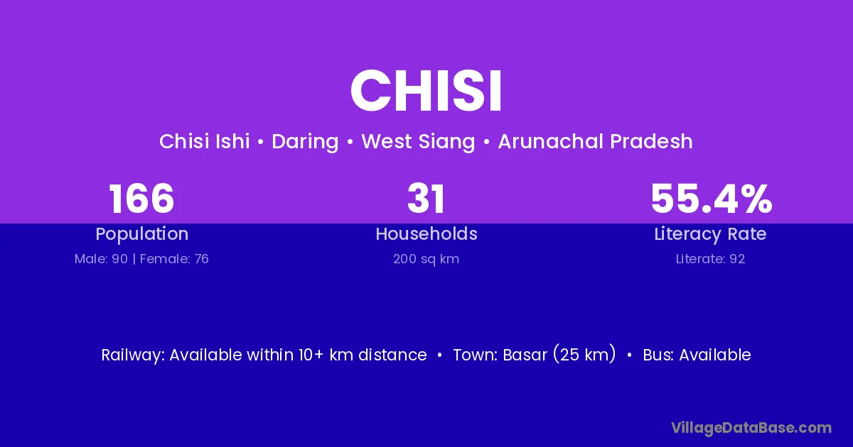 Basar (25 km) is the nearest town to Chisi village for major economic activities and is located approximately 25 km away.