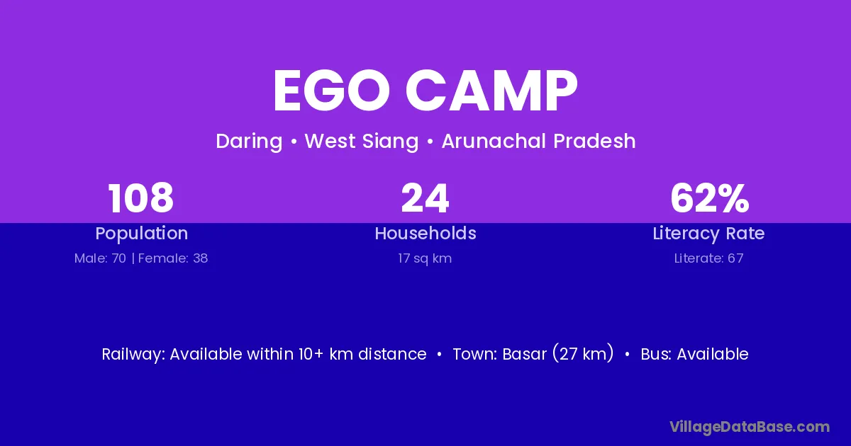 The literacy rate of Ego Camp village is 62.04%. Male literacy stands at 71.43% and female literacy at 44.74%.