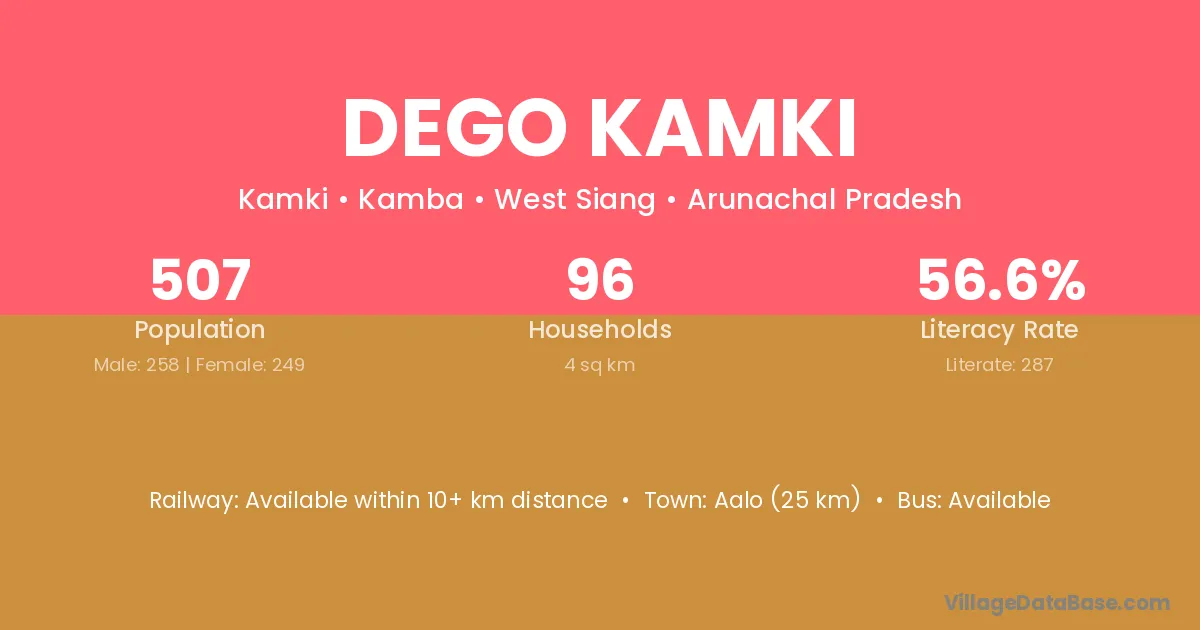 Dego Kamki village has a total population of 507 people, of which 258 are males and 249 are females.