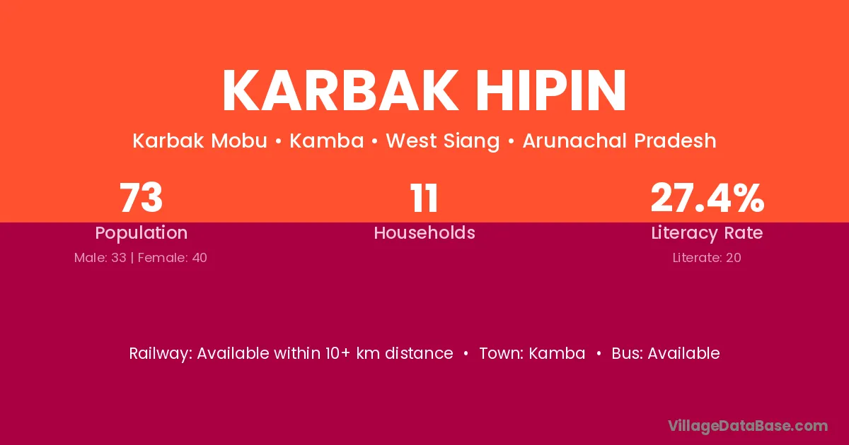 Karbak Hipin village has a total population of 73 people, of which 33 are males and 40 are females.