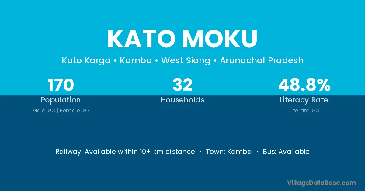 The literacy rate of Kato Moku village is 48.82%. Male literacy stands at 54.22% and female literacy at 43.68%.