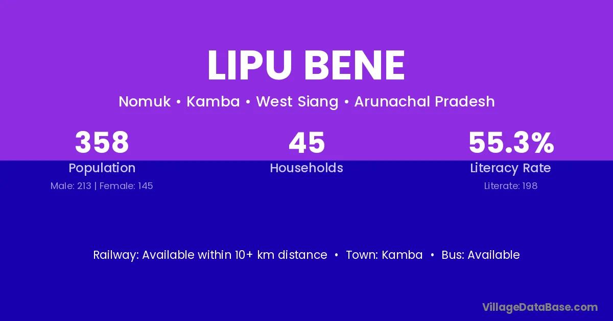 The literacy rate of Lipu Bene village is 55.31%. Male literacy stands at 53.52% and female literacy at 57.93%.