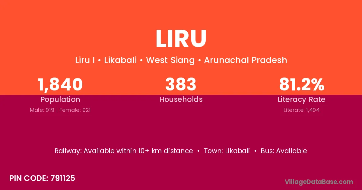 Liru village has a total population of 1,840 people, of which 919 are males and 921 are females.