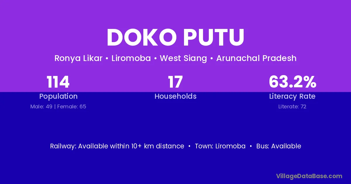 Doko Putu village has a total population of 114 people, of which 49 are males and 65 are females.