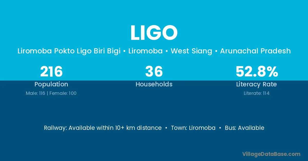 The literacy rate of Ligo village is 52.78%. Male literacy stands at 56.03% and female literacy at 49.00%.