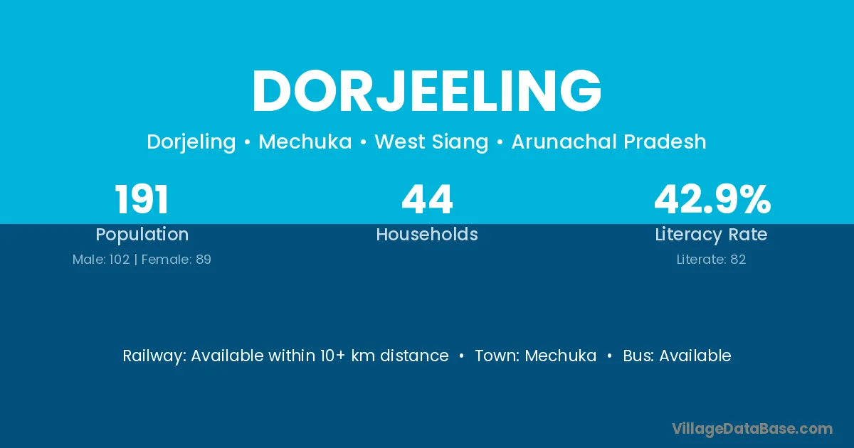 Dorjeeling village has a total population of 191 people, of which 102 are males and 89 are females.