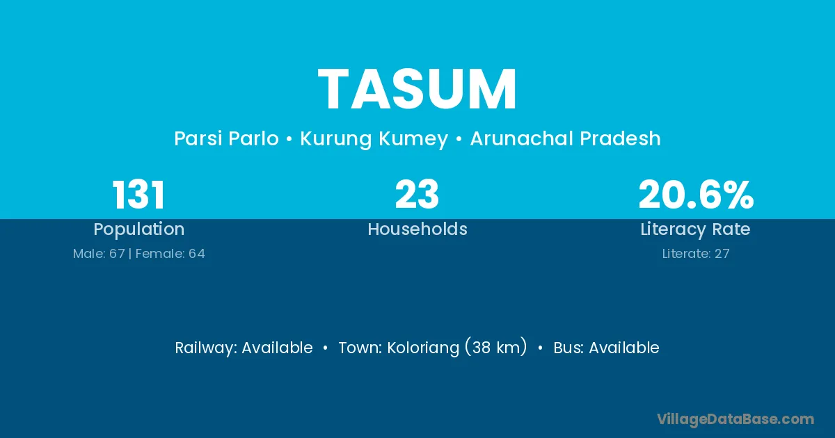 The literacy rate of Tasum village is 0.00%. Male literacy stands at 0.00% and female literacy at 0.00%.