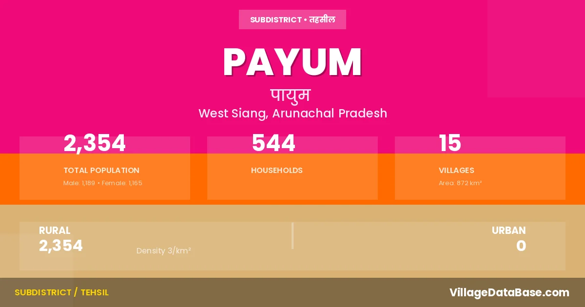 Payum is a town and Circle in the West Siang district of the Arunachal Pradesh. In India, a Circle is a subdivision of a district responsible for the administration and revenue collection of a specific area within the district. Circles play a crucial role in the local governance structure, contributing significantly to the development and administration of their communities.