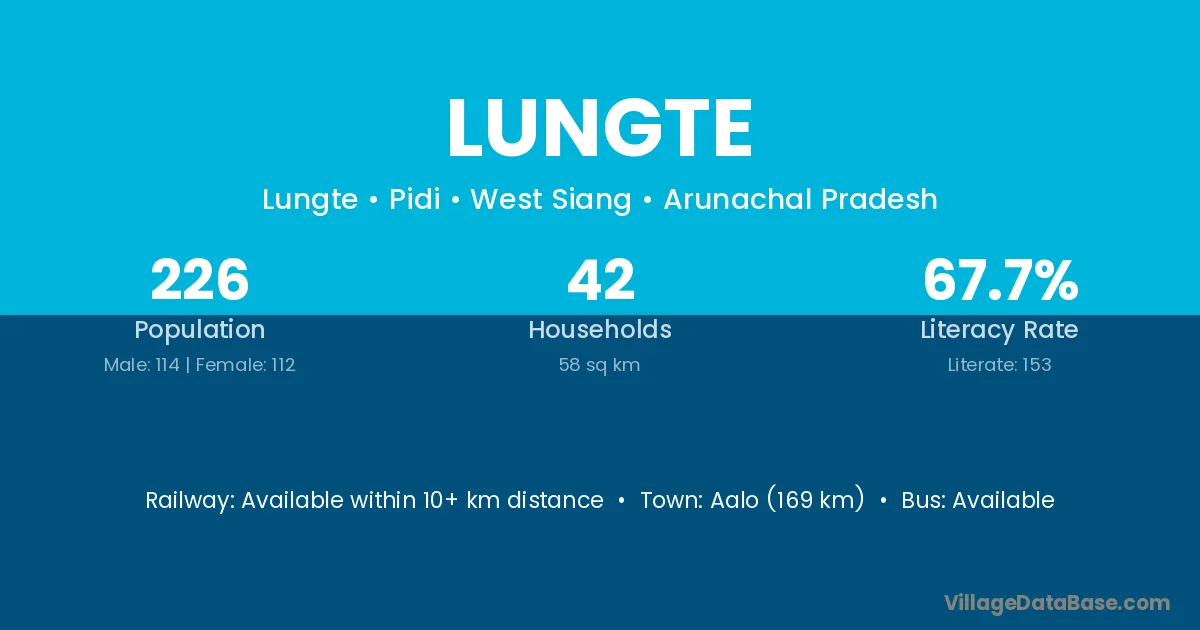 Aalo (169 km) is the nearest town to Lungte village for major economic activities and is located approximately 169 km away.